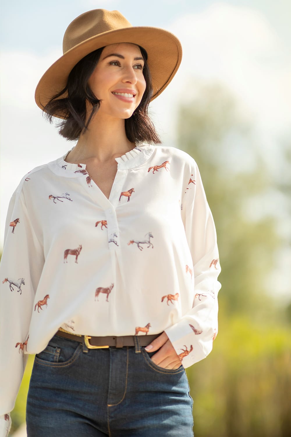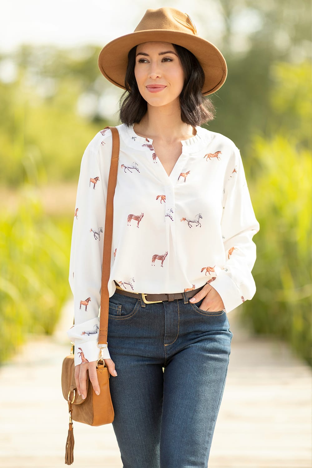 Our long sleeved blouse comes in an array of prints from Highland Cow to Walking Pheasant. These prints give a country feel and are guaranteed to add a unique touch to your outfit. A flattering collar giving a traditional country look giving smart, casual as well as fun. Ruffled trims for added flair and touch of elegance. The floaty design makes it fitting for any country activity. This would be great paired with denim trousers and a pair of printed trainers giving a pleasant, relaxed outfit.